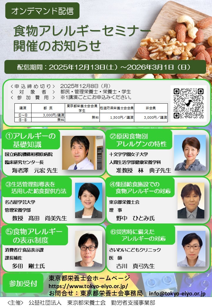 ※こちらはオンデマンド配信による講座です。。 開催期間 : 2025年12月13日(土)~2026年3月1日(日) 【生涯教育単位】 食物アレルギー FG23-101(1単位) 受講後、アンケートを2026年3月2日(月)までにご提出いただい方に付与いたします。 【申込締切】 2025年12月8日(月)締切 【受講期間】 ●2025年12月8日(月)~2026年3月1日(日) 【参加費】 学生・東京都栄養士会会員 : 無料 他道府県栄養士会会員 : 1,500円 一般(非会員) : 3,000円 【申し込みから受講までの流れ】 ・申込締切日後、「申込」及び「入金が確認できた方(有料区分申込の場合」へ初回の「受講に関する詳細案内」を事務局より一斉メール配信させて頂きます。 ・12/11(木)までに「受講に関する詳細案内」が未着の場合は12/12(金)の16時までに以下のお問い合わせよりメール連絡をお願い致します。 ・受講に関する詳細案内のメールが受信できなかったことに関しての返金対応は出来かねますので、予めご了承ください。 【受講費に関して】 ・お振込みでの支払い及びコンビニ支払いの場合は申込より3日以内に入金のお手続きをお願いいたします。 ・コンビニ支払い期限後は申込キャンセル扱いとなります。支払い期限後に申込締切が過ぎている場合は再度の申込はできませんのでご注意ください。 ・既納の受講料は、原則としてお返しいたしません。 【申込に関して】 ・申込締切期限後の申込受付はできかねますので予めご了承ください。 【注意事項】 ・ネット接続に関するお問い合わせには対応できませんのでご了承ください ・インターネット環境の良い場所でご参加ください。インターネット接続の不具合等の責任は一切負いかねますので、あらかじめご了承ください。通信料は、受講者負担になります。 ・本研修の録画、録音、撮影、スクリーンショット及びダウンロードは禁止になります。 ・お申込みいただきました個人情報につきましては、本研修会にのみ使用いたします。 ・ご不明な点がございましたら、下記までご連絡ください。 【お問い合わせ】 メールでのお問い合わせにご協力をお願い申し上げます。 メールアドレス:info@tokyo-eiyo.or.jp